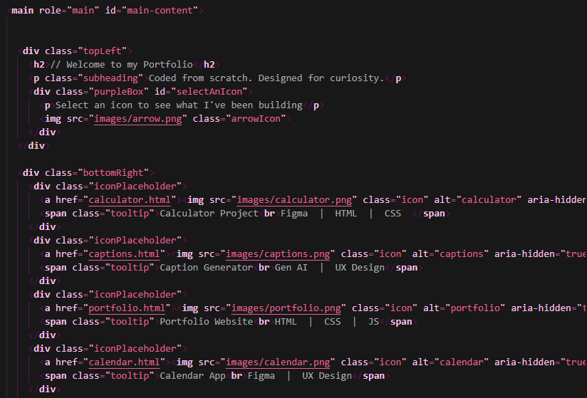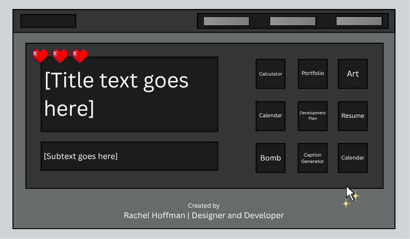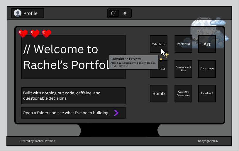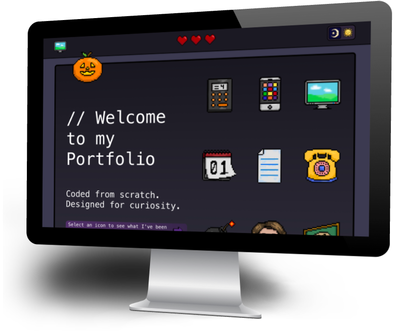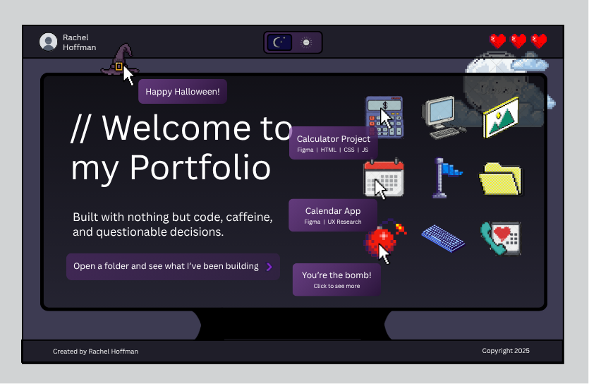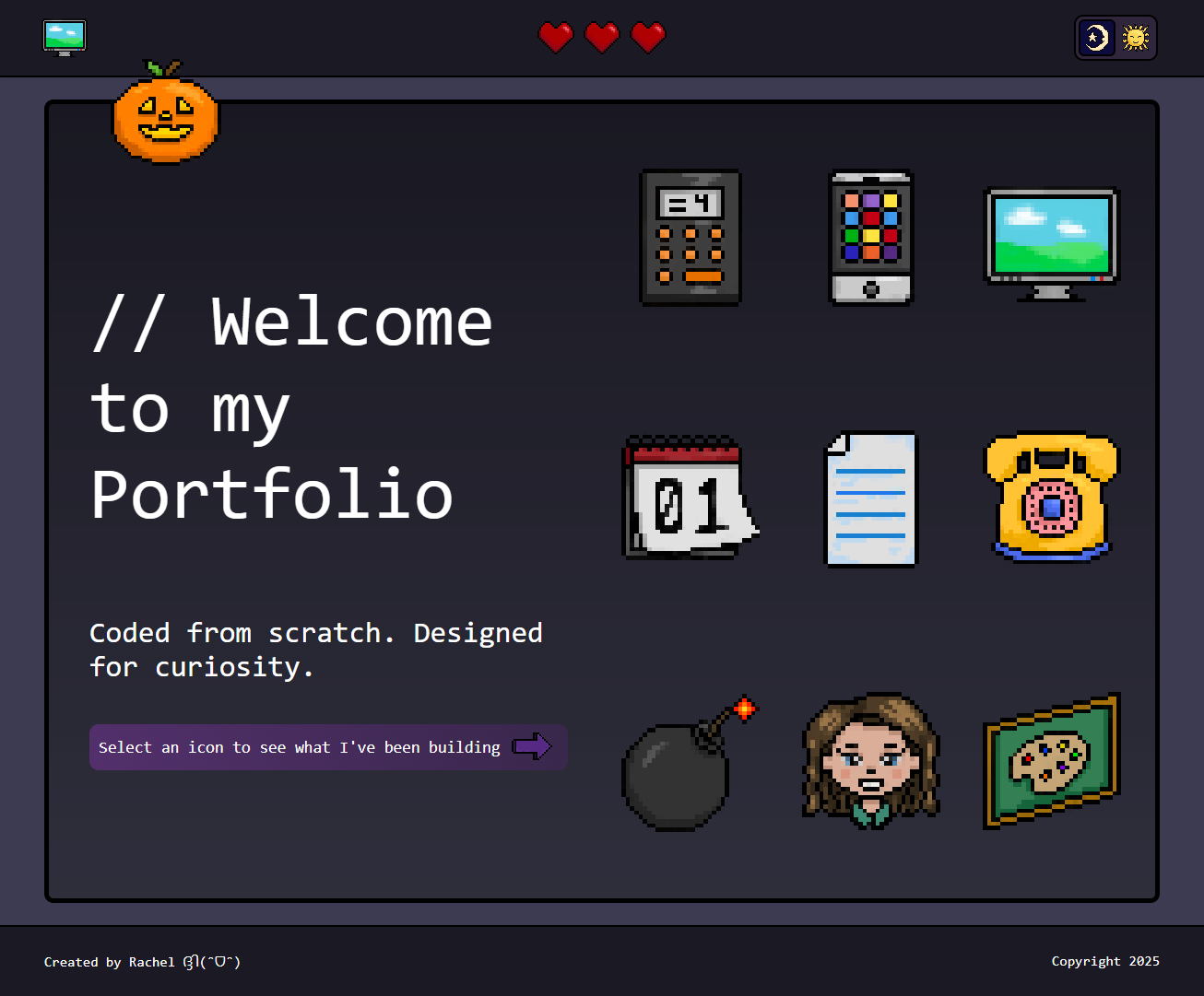 My goal was to create a portfolio that doesn't just show my work, but is a piece of my work. I focused on functionality and responsiveness first, then let myself get creative. I designed my own pixel art, playful UI elements, and interactive components. It’s a front-end project, but also a design project that I got to have a lot of fun with.